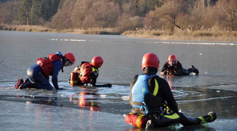Die Einsatzkräfte konnten sich in sicherer Umgebung mit dem Einbrechen im Eis und der darauffolgenden Selbstrettung vertraut machen. Natürlich darf nach Übungsabschluss eine Nachbesprechung, das ordnungsgemäße Versorgen der Materialien und der Schutzausrüstungen nicht fehlen.