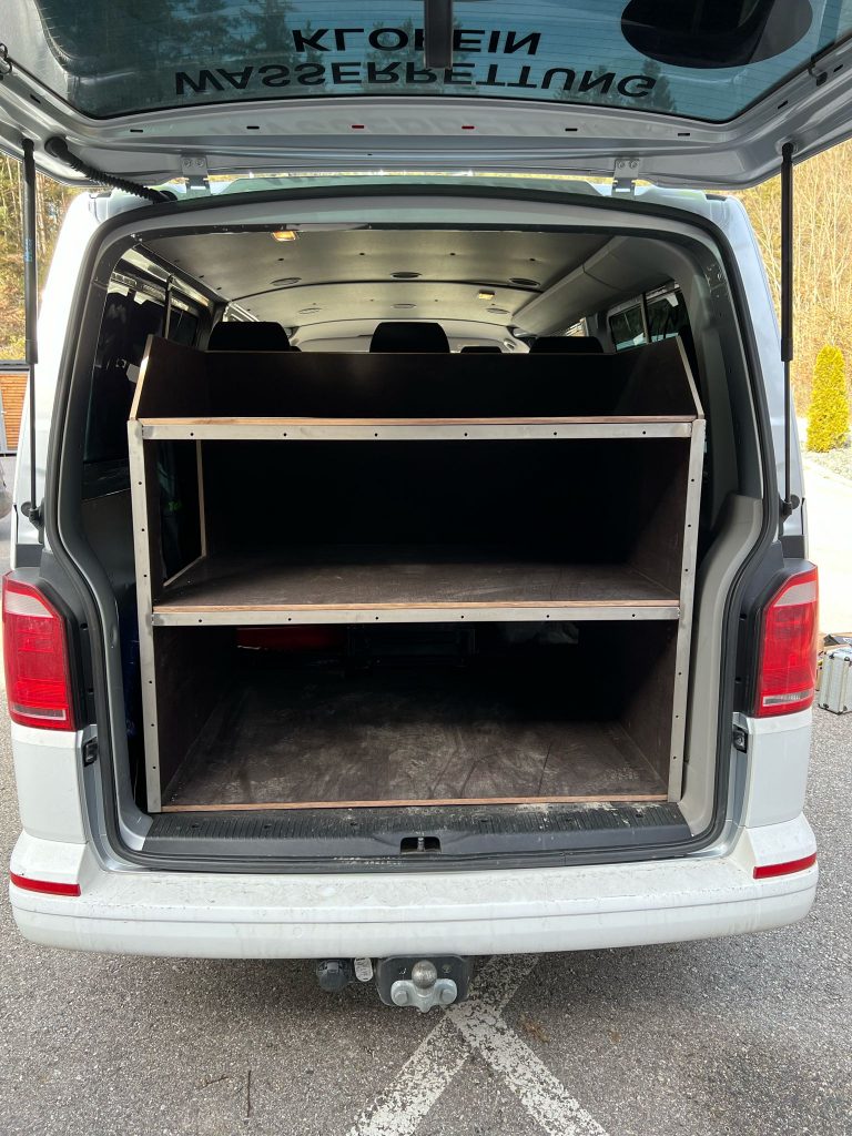 Im neu angeschafften Bus wurde ein Regal aus Multiplex Siebdruckplatten eingebaut und ein Metallrahmen dazu maßgenau angepaßt.