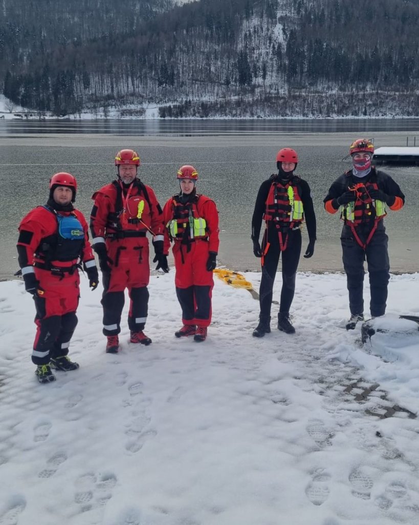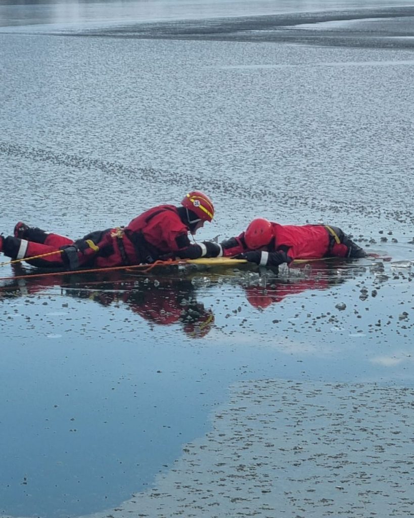 Im Rahmen der Übung wurden zunächst theoretische Inhalte wie Eisdicken, sicheres Bewegen auf dem Eis sowie verschiedene Rettungstechniken besprochen. Anschließend folgten praktische Einheiten zur Selbstrettung aus dem Eis sowie zur Fremdrettung – sowohl mittels Spineboard als auch mit dem Wurfsack.