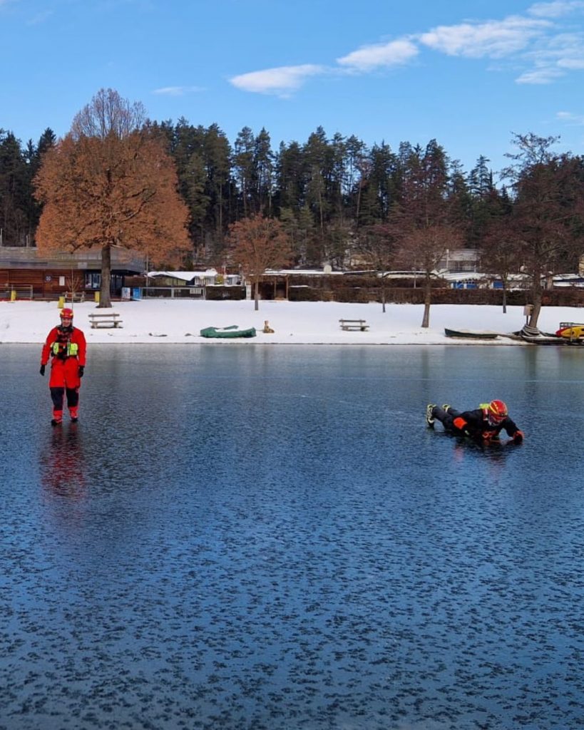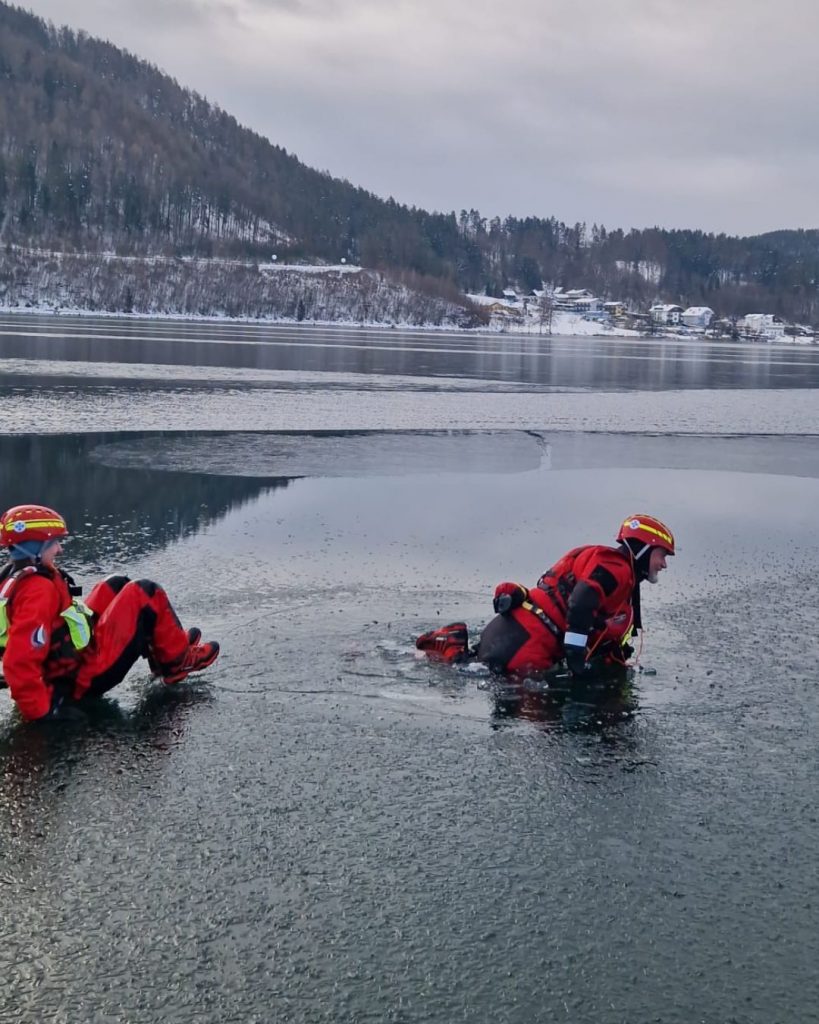 Solche Übungen sind ein wichtiger Bestandteil der Präventionsarbeit, um im Ernstfall – sollte eine Person ins Eis einbrechen – rasch, sicher und professionell helfen zu können.